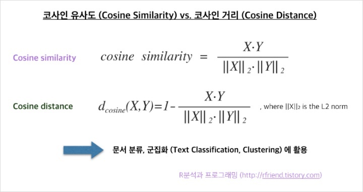 - 코사인 거리 : 문서 유사도를 기준으로 분류 혹은 그룹핑 할 때 사용