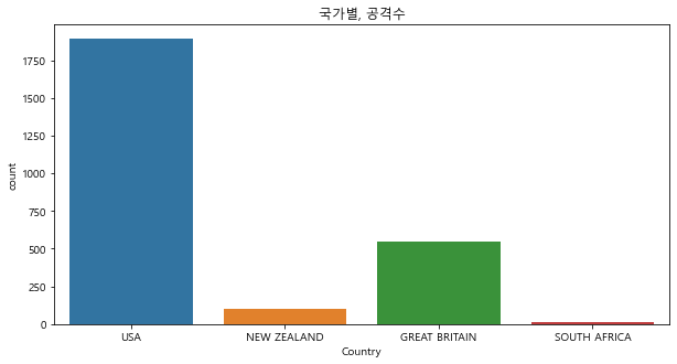 plt.title("국가별, 공격 수")